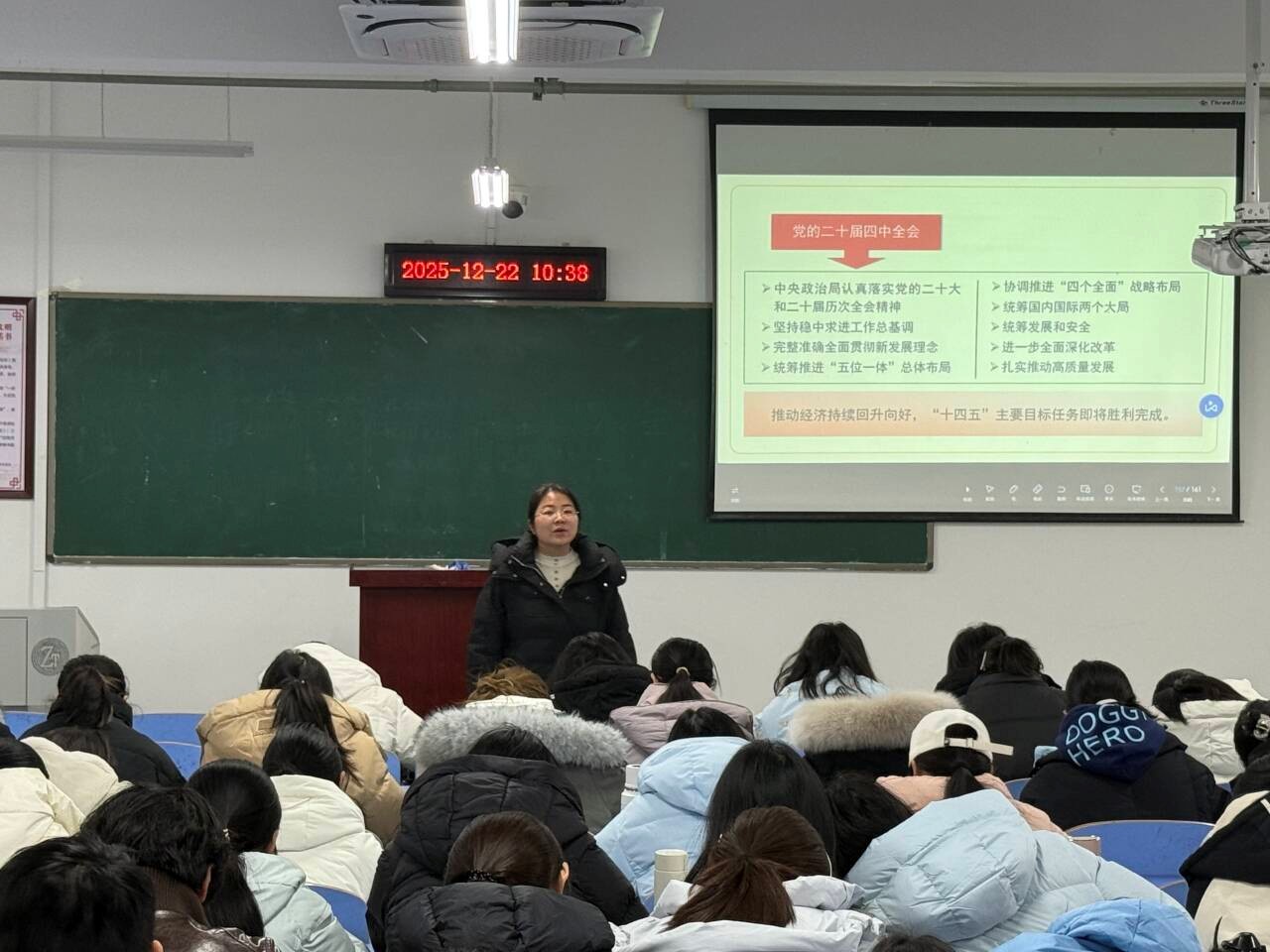 李朦老师强调,国家安全是民族复兴的根基,社会稳定是国家强盛的前提。她结合当前国际国内形势,运用生动的案例和详实的数据,深入分析了我国国家安全面临的风险挑战,并重点解读了全会提出的关于健全国家安全体系、增强维护国家安全能力、提高公共安全治理水平、完善社会治理体系等一系列新论断、新要求、新部署。